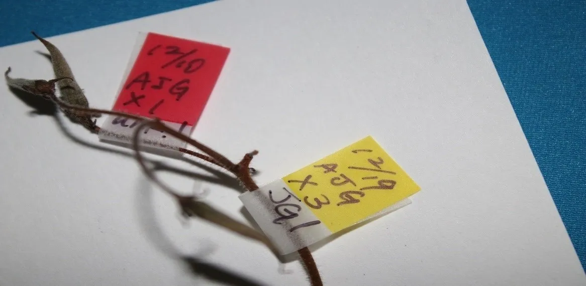 The red flag indicates that on December 10, a flower from plant AJGwas pollinated with pollen from plant UNK. The yellow label shows that on December 19, the three remaining unpollinated flowers on that same peduncle were pollinated with pollen from plant JG1.