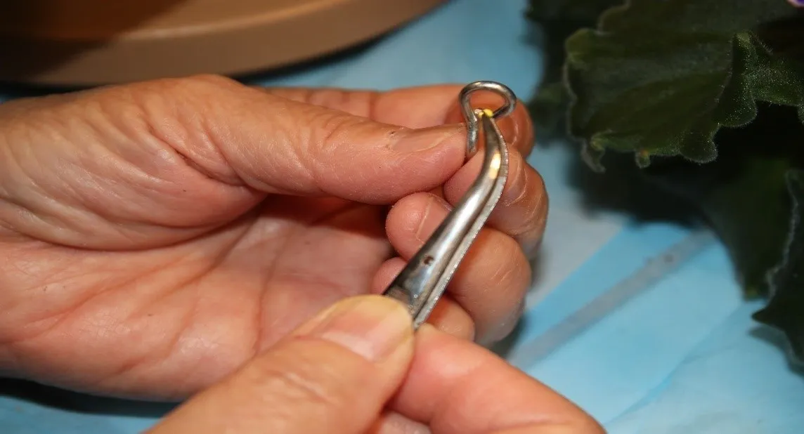 In Photo 4 shows how a chain link is used to clamp the tweezers, allowing her hands to relax while holding the anthers.